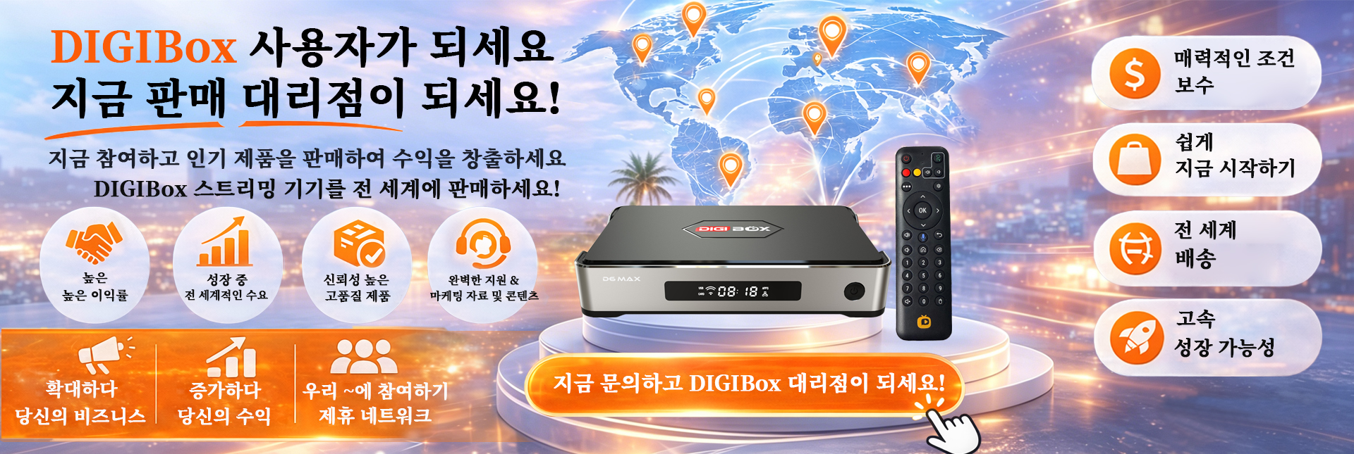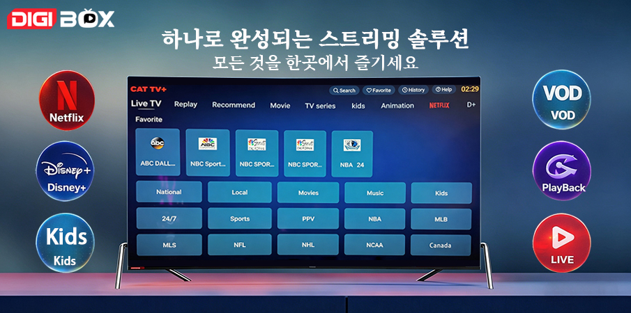 미국에 있든 지구 반대편에 있든, DIGIBox는 전 세계 어디서나 호환됩니다. 인터넷만 연결되어 있다면 언제 어디서든 콘텐츠를 스트리밍할 수 있으며, 진정한 글로벌 엔터테인먼트를 즐기실 수 있습니다.